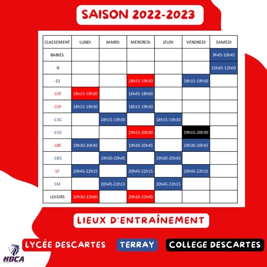PLANNING DES ENTRAINEMENTS SAISON 2022/2023